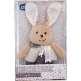 Pehmeä kaninmuotoinen helistin veluurista, joka on helppo tarttua pienillä käsillä.