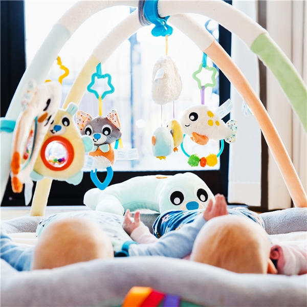 Playgro Snuggle Me Penguin Tummy Time Babygym on hieno vauvan jumppalelu ihanin värein. Jumppalelussa on superpehmeä plyysinen alusta, jossa on pingviinin kuva. Jumppalelussa on irrotettavat kaaret ja 5 riipustuslelua, helistin, purulelu ja peili.