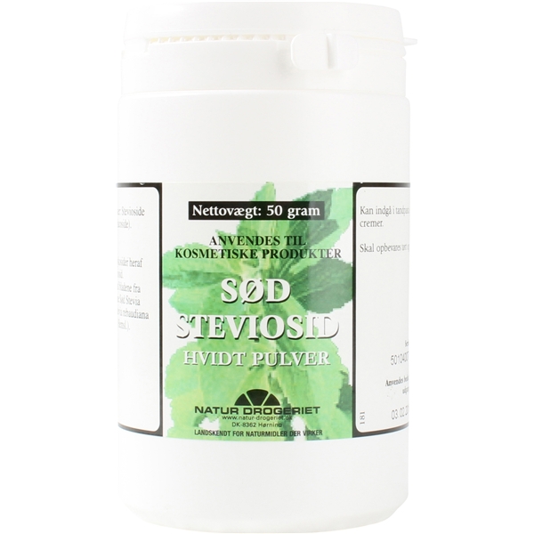 Valkoinen steviosid-jauhe kosmetiikkatuotteisiin. Käyttö: kosmeettiseen käyttöön, esim. Mietoon ja miellyttävään ihon käsittelyyn.