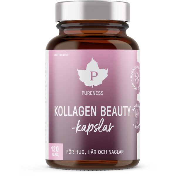 Pureness Kollagen Beauty -kapseli on yhdistelmä maailman tutkituimmasta kollageenipeptidistä Verisol®, C-vitamiinista, Trippel Zink™:stä sekä biotiinista kätevässä kapselimuodossa.Kollageeni, C-vitamiini, sinkki ja biotiini ovat muun muassa tärkeitä ihon, kynsien ja hiusten rakentumiselle. C-vitamiini ja sinkki ovat lisäksi antioksidantteja.Kapseli on helppo niellä pienen nestemäärän kanssa.