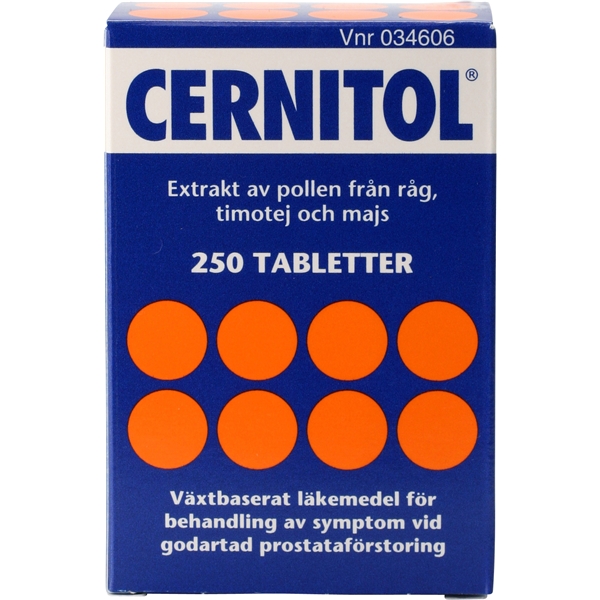 Cernitol on kasviperäinen lääkevalmiste eturauhasen hyvälaatuisen liikakasvun hoitoon, esim. tihentynyt virtsaamistarve ja yövirtsaaminen. Cernitol vähentää oireilua hyvälaatuisessa eturauhasen liikakasvussa. Käytetään kun lääkäri on poissulkenut vakavamman sairauden olemassaolon. Ota yhteyttä lääkäriin jos oireet pahentuvat tai oireilu jatkuu kauemmin kuin kuusi kuukautta. 2005 astui uusi eurooppalainen lääkeainelaki voimaan. Jotta saisi lääkeaineen hyväksytyksi tulee osoittaa sekä vaikutus että turvallisuus kliinisissä tutkimuksissa. Cernitol on läpikäynyt lukuisia kliinisiä tutkimuksia on se nykyään luokiteltu kasviperäiseksi lääkeaineeksi.Vaikutukset: Allergisia oireita samoin vatsa-suolisto-oireita on raportoitu.Eturauhanen sijaitsee virtsarakon alapuolella miehille ja kiinnittyy virtsaputken yläosaan. Sen kasvu määrittyy mieshormonin, testosteronin toimesta ja hormonaaliset muutokset kuten ikääntyminen vaikuttavat eturauhasen kasvuun. Tätä kutsutaan eturauhasen hyvälaatuiseksi liikakasvuksi. 50-vuoden iässä on eturauhanen suurentunut useimmilla miehillä, mutta kaikki eivät saa vaivoja siitä. Osalla tämä kuitenkin aiheuttaa vaivoja virtsaamisessa. Nämä vaivat voivat olla tihentynyt virtsaamistarve ja vaikeudet saada koko rakkoa tyhjäksi.Osa vakavista sairauksista, mm. eturauhas- tai virtsarakkosyöpä, voivat oireilla samalla tavalla.Lue mukana tuleva ohje tai päälipakkauksen ohjeistus tarkkaan. Huom! 18-v ikäraja reseptittömissä lääkeaineissa!