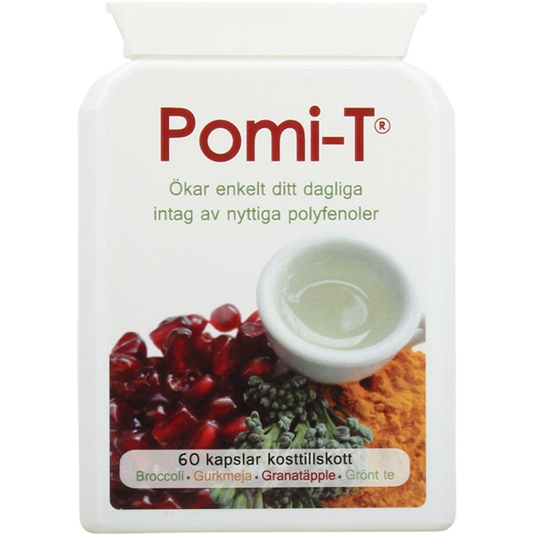 Pomi-T on luonnollinen, polyfenolia sisältävä ravintolisä sisältäen valittuja ainesosia kuten parsakaali, granaattiomena, kurkuma ja vihreä tee. Ainesosia, jotka ovat luonnollisia polyfenoleiden lähteitä. Pomi-T on tieteellisesti tutkittu 6 kk ajan.