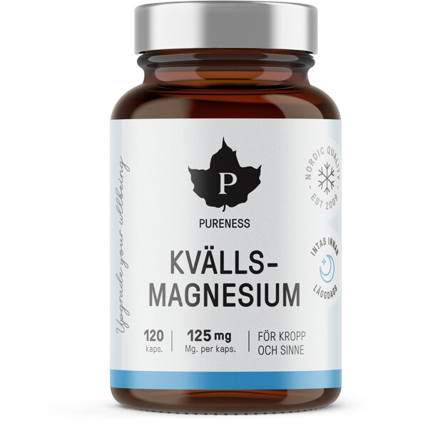 Pureness Ilta-magnesium on ravintolisä, joka sisältää magnesiumia ja yrttiuutetta ja on suunniteltu edistämään parempaa unta ja rentoutumista! Täydellinen sinulle, joka ehkä tunnet olosi stressaantuneeksi tai sinulla on univaikeuksia.Magnesiumin muoto on magnesiumbisglysinaatti, magnesiumin muoto, jolle on ominaista olla erittäin vatsaystävällinen, omaa korkean imeytymiskyvyn sekä rauhoittavan vaikutuksen, koska aminohappo glysiini, joka on sitoutunut magnesiumiin, toimii rauhoittavana välittäjäaineena kehossa.