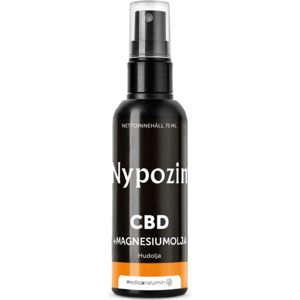 Nypozin CBD + Magnesiumöljyyn on lisätty synteettistä CBD:tä, joka on sallittu kosmetiikassa. Sisältää 3500 mg magnesiumkloridia ja 231 mg CBD:tä per 75 ml. Tämä vastaa 50 mg magnesiumia ja 3 mg CBD:tä per ml. 5 suihkausta on noin 1 ml.
