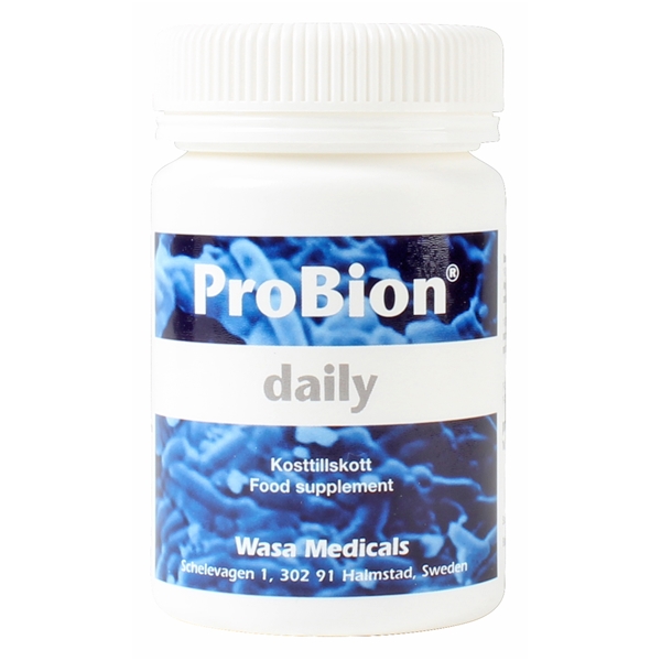 ProBion - se fiksu tabletti. Tabletti on muodostettu sillä tavalla, että se suojaa laktobakteereita vatsassa/suolistossa kulun aikana niin, että ne ovat täynnä toimivia aineita siellä missä niitä tarvitaan. Tabletti liukenee hitaasti ja jakaa bakteereita suurelle alueelle. Tämä on suuri etu verrattuna kapseleihin tai jauheesee, jossa bakteerit ovat suojaamattomia ja tuhoutuvat helposti. ProBion Daily vahvistaa yleistä hyvinvointiasi tukemalla ruoansulatussysteemiä. Probion Daily sisältää suuren määrän eläviä laktobakteereita, väh. 500 miljoonaa / gramma, ja 5 erilaista lajia. Sen lisäksi se sisältää inuliinia, joka tukee laktobakteerien kasvua. Yhdessä ne luovat ympäristön, jossa terveellinen suolen toiminto vahvistaa kehon kaikkia toimintoja. ProBionia valmistetaan Wasa Medicalsin toimesta GMP-standardien mukaisesti. Riippumaton ruotsalainen laboratorio tekee analyyseja raakamateriaalista ja valmiista tuotteesta jotta tuotteelle voidaan taata paras mahdollinen laatu. ProBion on tasapainoinen tabletti joka patentoidun tekniikan avulla on taatusti yhtä toimiva vielä 24 kuukauden jälkeen valmistuksesta huoneenlämmössä säilytettynä. Monet muut laktobakteerituotteiden valmistajat ilmoittavat vain toimivien bakteereiden määrän valmistusvaiheessa.