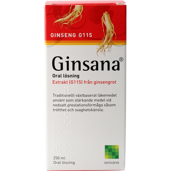 Aktiivinen ainesosa:Panax ginseng radix uutetta (G115) 100 mg (1,3-3,2:1) per kapseli. Uute sisältää 43-68% laktoosimonohydraattia ja 2% kolloidista vedetöntä piidioksidia. Epäaktiiviset ainesosat:Lecitiini, soijalecitiini, vahasekoitus, rapsiöljy, etylivanilliini, gelatiini, glyceroli 85%, Anidrisorb 85/70, musta ja punainen rautaoksidi (E172)Lisäaineita: sakkaroosi, Etanoli, sokeriliköri, polysorbaatti 20, natriumhydroxidi, puhdistettu vesi, pomeranssi ka lakritsa. Päiväannos Ginsanaa alkoholilla vastaa 5-10 cl kevytolutta.