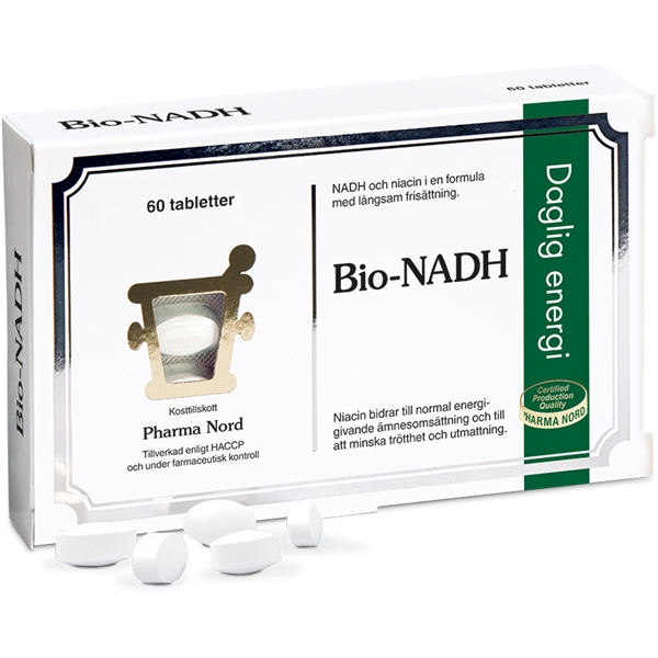 Niasiini ja NADH hitaalla vapautumisella, Bio-NADH on ravintolisä koostues valkoisista tableteista, jotka sisältävät 250 mgr niasiinia ja 2 mgr NADH'ta. Suositusannostus on 2-3 tablettia per päivä.